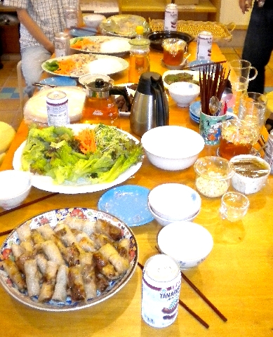 ベトナム料理教室の料理は (1)鳥の春雨スープ麺 (2)揚げ春巻き 春雨めんは鶏ガラスープで、鳥肉やレバーも入っていますがさっぱり味でおいしかったです。