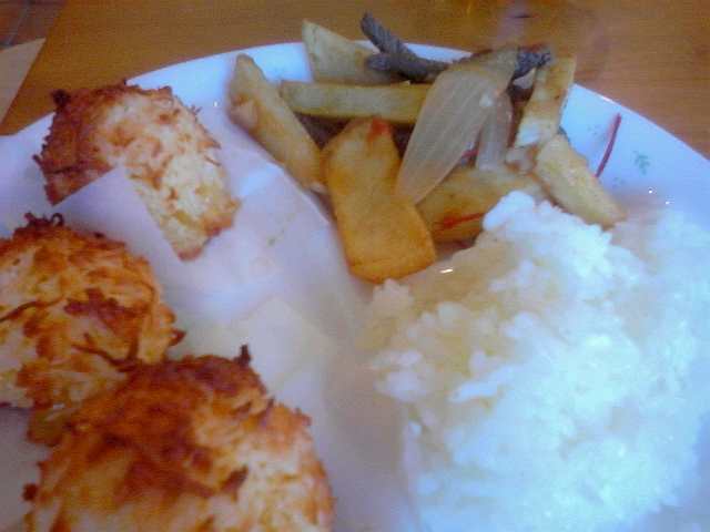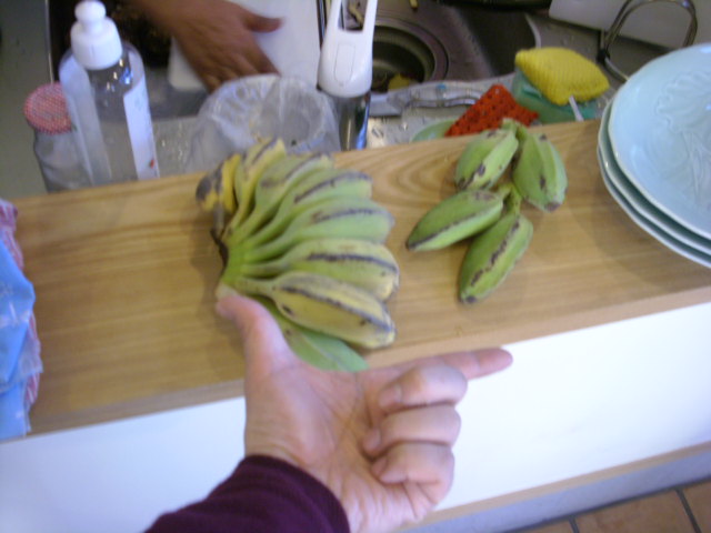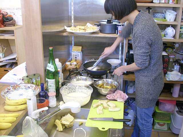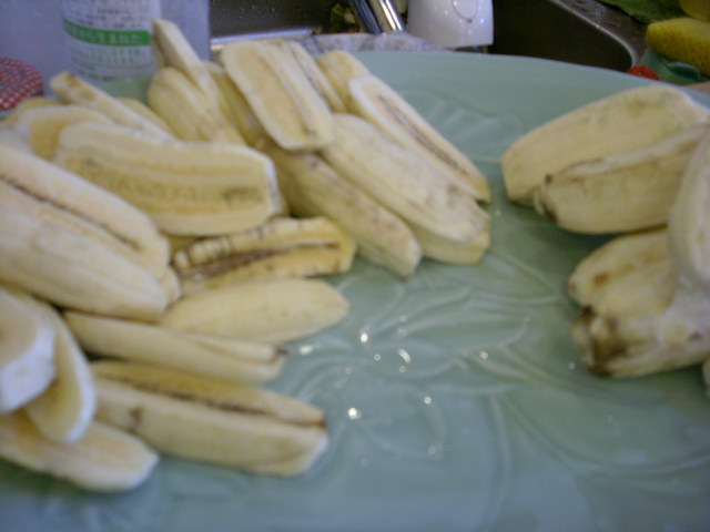 2)バナナの揚げ菓子は、熟したバナナを半分に切って、つぶして、パン粉につけてから、水に溶いた小麦粉をつけて揚げます。パン粉をつけるのは水分を吸ってやわらかくなるからかな。