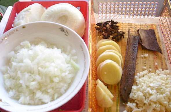 タマネギとスパイス 調理中 揚げ油から揚げかすを除く